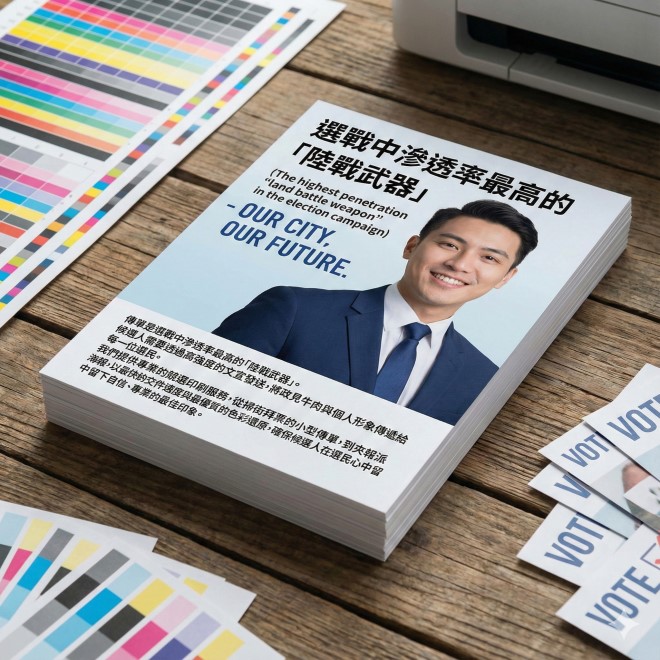 產品簡介: 傳單是選戰中滲透率最高的「陸戰武器」。候選人需要透過高強度的文宣發送,將政見牛肉與個人形象傳遞給每一位選民。我們提供專業的競選印刷服務,從掃街拜票的小型傳單,到夾報派送的大型海報,以最快的交件速度與最優質的色彩還原,確保候選人在選民心中留下自信、專業的最佳印象。