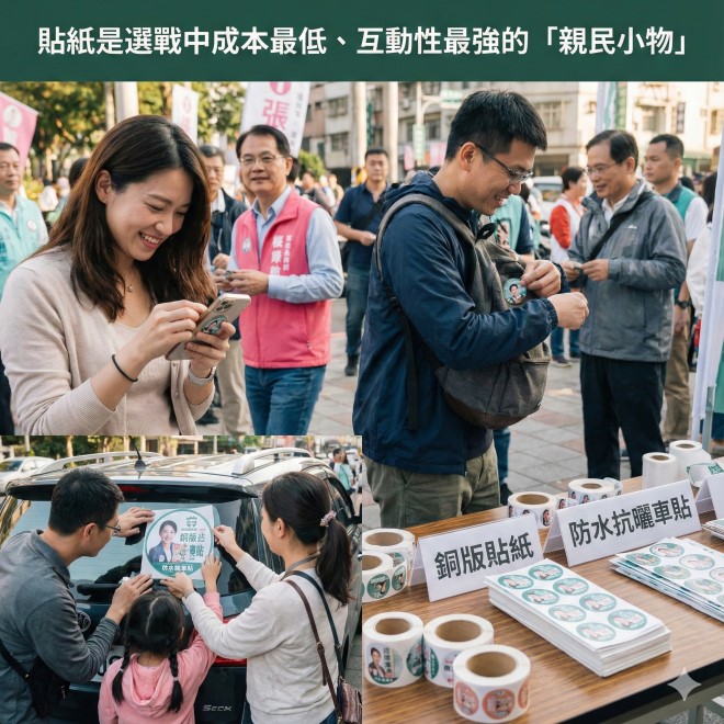 產品簡介: 貼紙是選戰中成本最低、互動性最強的「親民小物」。不同於被動閱讀的傳單,貼紙能讓支持者主動貼在身上、手機或車輛上,將每一位支持者都變成您的「移動助選員」。我們提供從造勢晚會發送的銅版貼紙,到貼在宣傳車上的防水抗曬車貼,全方位滿足競選團隊的宣傳需求。